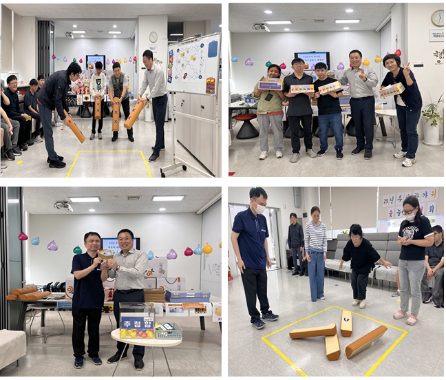 ‘25년 추석 한가위 윷놀이 대회 및 행운권 추첨 행사‘25년 추석 한가위를 맞이하여 직원들과 전통놀이인 대형윷놀이 대회를 열었다. 팀별 대항전으로 노랑팀, 파랑팀, 초록팀, 빨강팀이 저마다 멋지게 대형 윷가락 던져서 원하는 ’도, 개, 걸, 윷, 모‘ 나오면 박수와 응원의 함성이 터져나왔고, 우승팀은 빨강팀으로 아슬아슬하게 1등의 영광을 차지했다. 다음으로는 행운권 추첨시간, 34명의 직원들과 함께 행운권추첨을 했다. 백화점상품권, 애경선물세트, 김선물세트, 극세사잠옷 등 다양한 경품이 준비되었다. 오늘의 최고의 행운은 환경지원파트 이*석사원에게 영광이 돌아갔다. 추석 한가위 풍성하고 건강하게 잘 보내시길 기원드리며, 항상 행복합시다. ![]() |